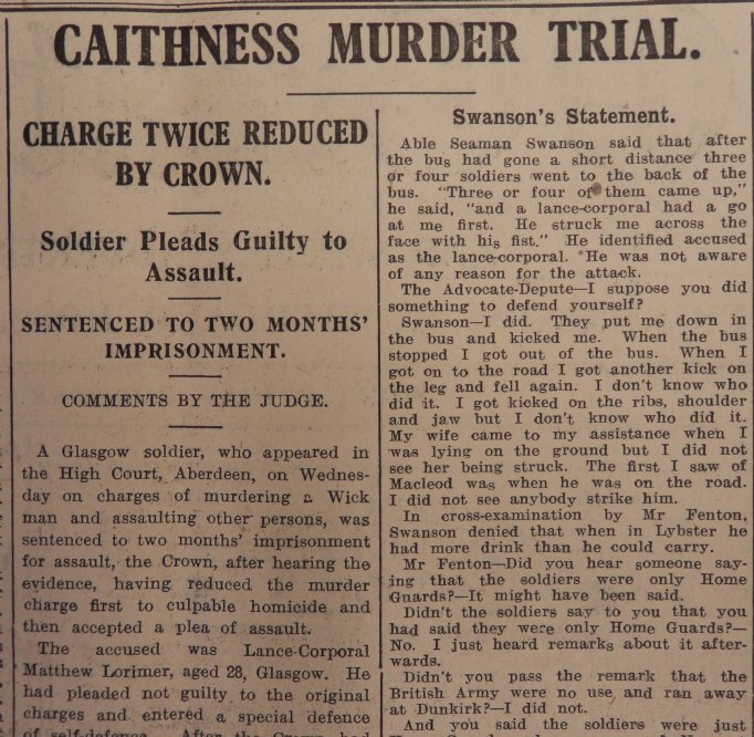 The John O’Groat Journal also reported that a Glasgow soldier, Matthew Lorimer, was tried in Aberdeen this week, accused of murdering a Wick man and assaulting several other persons. A group of soldiers had travelled on the bus from Lybster to Wick back in August, and soon after leaving Lybster an altercation had started between some of the locals and the soldiers. It was alleged that the locals had suggested that the soldiers were only Home Guard, and accused the British Army of running away at Dunkirk. A fight broke out, and when it was over Donald Bremner Macleod lay dead. But in the course of the trial it emerged that there was no way of proving that Mr Macleod’s injuries were the result of the fighting, nor of proving just who had struck whom; and in the end the charges were dropped, except for one of assault, and Matthew Lorimer was allowed to go free.