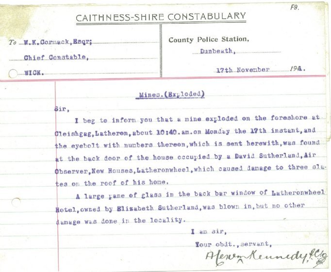 am. The Dunbeath police constable forwarded an eyebolt which was “found at the back door of the house occupied by David Sutherland, Air Observer, New Houses, Latheronwheel, which caused damage to three slates on the roof… A large pane of glass in the back bar window of Latheronwheel Hotel, owned by Elizabeth Sutherland, was blown in, but no other damage was done in the locality.”A row had developed over the use the Miller Institution gymnasium by Thurso Home Guard. After complaints that they had worn boots in the gym, the school management committee had now revoked their permission, prompting a letter in the Caithness Courier which referred to those who had complained as “potential Quislings”. The John O’Groat Journal now reported Provost Brims’ angry response: “The writer of this article… I can only characterise as being himself a contemptible potential Quisling. He is an ignorant person, or a very badly trained member of the Home Guard, or a mischievous busybody”.