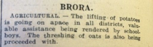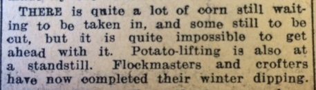 Back in Caithness, Bilbster School was experiencing a particularly unsavoury problem on 21 November: “An insanitary odour near the fireplace in the senior class room was reported to the Clerk of Works. When a joiner removed some of the floor boards a dead rat was discovered beneath the fireplace.”Across the county, the John O’Groat Journal reported an unusually late harvest. The district