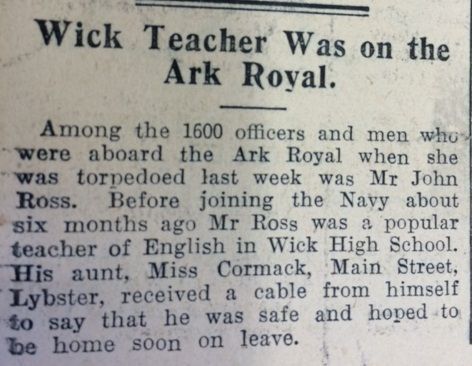 Finally this week, the John O’Groat Journal reported the happy news that Mr John Ross, an English teacher in Wick High School, who had been serving on board HMS Ark Royal when it was sunk by a U-boat on 10 November, had escaped with the rest of the crew and was expected home soon in Lybster.