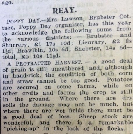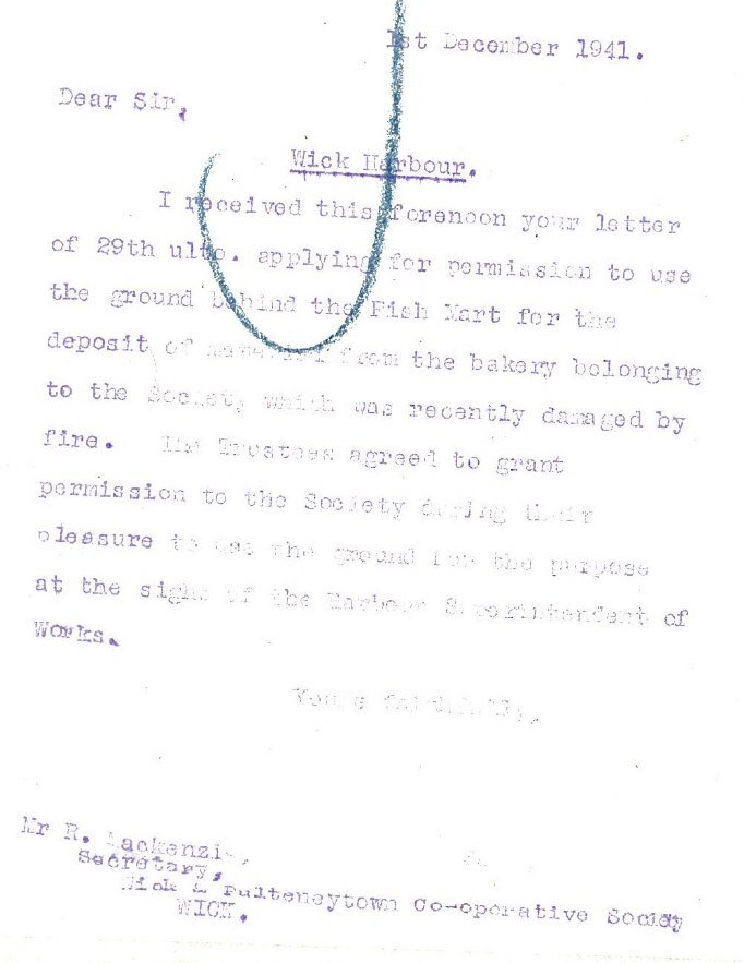 Following the recent damage to the Cooperative Society stores, the Society had written to the Wick Harbour Trust “for permission to use the ground behind the Fish Mart for the deposit of material from the bakery belonging to the Society, which was recently damaged by fire”. The Secretary of the Harbour Trust now replied, agreeing “to use the ground for the purpose at the sight of the Harbour Superintendent of Works.”Finally this week, and remarkably, while the Germans outside Moscow struggled with blizzard conditions, some parts of Caithness were still bringing in the harvest. The John O’Groat Journal reported that in Reay “a good deal of grain is still ungathered and, although in hand-rick, the condition of both corn and straw cannot be too good.” Although some farms had secured their potato crop, “on other crofts and farms the crop is still in the ground.”