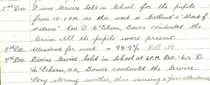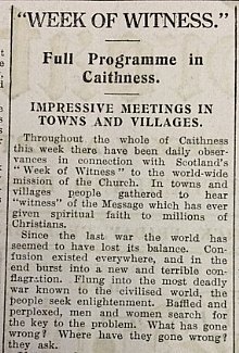 Back in Caithness, the people were participating in Scotland’s “Week of Witness” to the world-wide mission of the church. As the John O’Groat Journal observed, “In towns and villages people gathered to bear “witness” of the Message which has ever given spiritual faith to millions of Christians.”Services were held in schools across the county, conducted by the local Minister. The head
