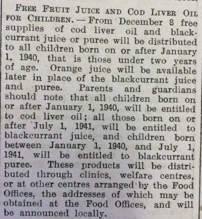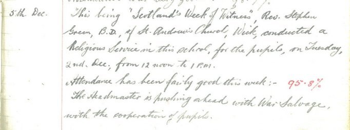 teacher for Stemster School in Bower wrote in the log book on 2 December: “Divine service held in school for the pupils from 12-1 P.M. as this week is Scotland’s “Week of Witness”. Rev. D. McEchern, Bower, conducted the service. All the pupils were present.” Another service was held in the school on Sunday 7 December, but this time there was “very stormy weather, thus causing a poor attendance.” Killimster School also held a service for all pupils on 2 December, this time conducted by Rev. Stephen Green of St Andrew’s Church in Wick. The county’s salvage drive was underway and the School Log Book entry for 5 December adds: “The Headmaster is pushing ahead with War Salvage, with the cooperation of pupils.”The John O’Groat Journal reported that, “From December 8 free supplies of cod liver oil and blackcurrant juice or puree will be distributed to all children born on or after January 1 1940, that is those under two years of age.” The products would be available from designated centres; “orange juice will be available later in place of the blackcurrant juice.”