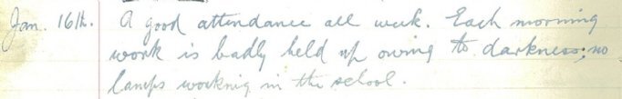 But Killimster School in Wick faced a different problem. On the same day their log book notes, “A good attendance all week. Each morning work is badly held up owing to darkness; no lamps working in the school.”