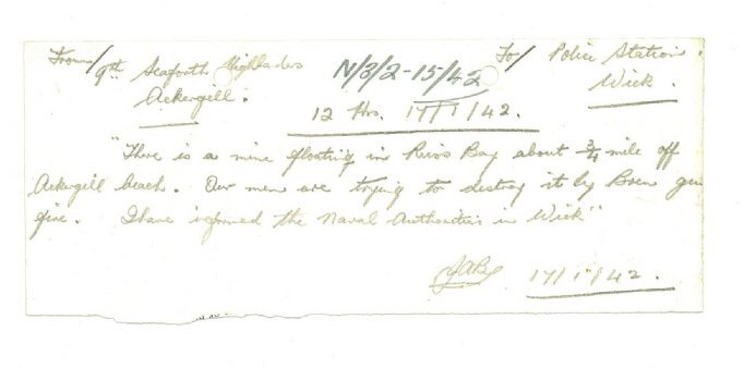 Meanwhile the danger of mines washing ashore in Caithness continued, and these were sometimes dealt with by direct action. On 17 January the 9th Seaforth Highlanders at Ackergill sent the following message to the police at Wick: “There is a mine floating in Reiss Bay about ¾ mile off Ackergill beach. Our men are trying to destroy it by Bren gun fire. Have informed the Naval Authorities in Wick.”On 12 January the SS Empire Parsons ran aground on Stroma. The Receiver of Wrecks