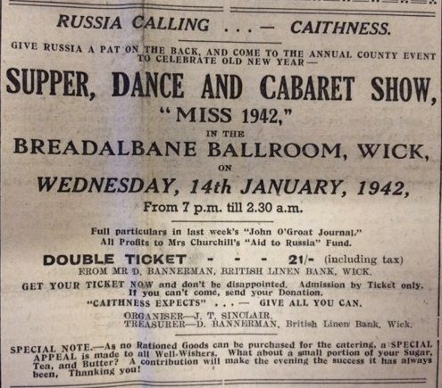 recorded the incident in the log: “Vessel proceeding in convoy through Pentland Firth when all shore lights were suddenly extinguished. A gale was blowing at time & a strong ebb tide was flowing. The “Empire Parsons” was in ballast & went aground at Scarton Point on S.E. point of Stroma Island. Crew were taken off by Breeches Buoy. Vessel badly damaged – engine room flooded.” Finally this week, Wick celebrated the “Miss 1942” supper, dance and cabaret show. All proceeds were to go to the Aid to Russia Fund, and the event was advertised with the slogan, “Russia Calling – Caithness: Give Russia a pat on the back and come to the annual county event to celebrate Old New Year.” But the war had its impact even here: “As no Rationed Goods can be purchased for the catering, a Special Appeal is made to Well-Wishers. What about a small portion of your Sugar, Tea and Butter?”Miss 1942 was Miss H. Manson of Keiss, which led “Norseman” in the John O’Groat