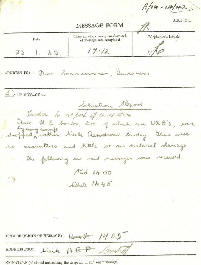 months. However on 23 January this changed dramatically, as the following message from Wick A.R.P. Control shows: “Further to report of 14.10 hours. Three H.E. [high explosive] bombs, two of which are UXB’s [unexploded bombs], were dropped by enemy aircraft within Wick Aerodrome today. There were no casualties and little or no material damage”. This explains the following entry in Ackergill School log book for the same day, as Ackergill lies almost adjacent to Wick airport runway: “This afternoon we spent nearly an hour in the [air raid] shelter. The children were dismissed after the “All Clear”.”
