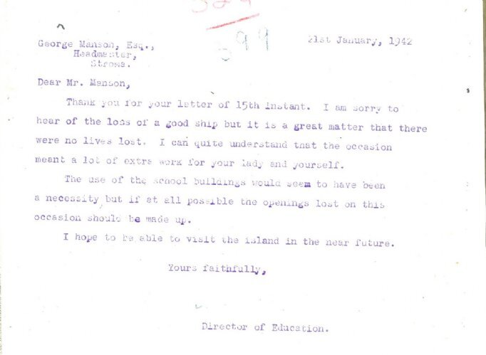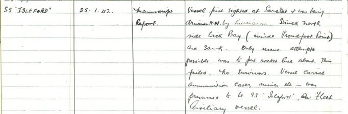saved. This week the Director of Education wrote to the Headmaster of Stroma School regarding the use of the school to take in the survivors: “I am sorry to hear of the loss of a good ship but it is a great matter that there were no lives lost. I quite understand that the occasion meant a lot of extra work for your good lady and yourself. The use of the school buildings would seem to have been a necessity but if at all possible the openings lost on this occasion should be made up.” Finally this week there was another shipwreck, and one with a much sadder outcome. SS Isleford was a small coaster on its way from Lyness to Invergordon. The entry in the Receiver of Wrecks log book tells the story: “Vessel first sighted at Sarclet & was being driven N.W. by hurricane. Struck north side Wick Bay (inside Proudfoot Point) and sank. Only rescue attempt possible was to put rocket line about. This failed. No survivors. Vessel carried ammunition cases, mines etc. – was presumed to be SS Isleford, a Fleet Auxiliary vessel.”It appears that concerns grew down the years that divers might try to reach the wreck, which would be potentially dangerous because of the contents. So in the summer of 1992 the Royal Navy mounted an operation to remove as much of the ordnance as they could find, though because the ship had broken up it was not possible to reclaim all of it.