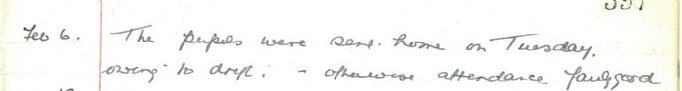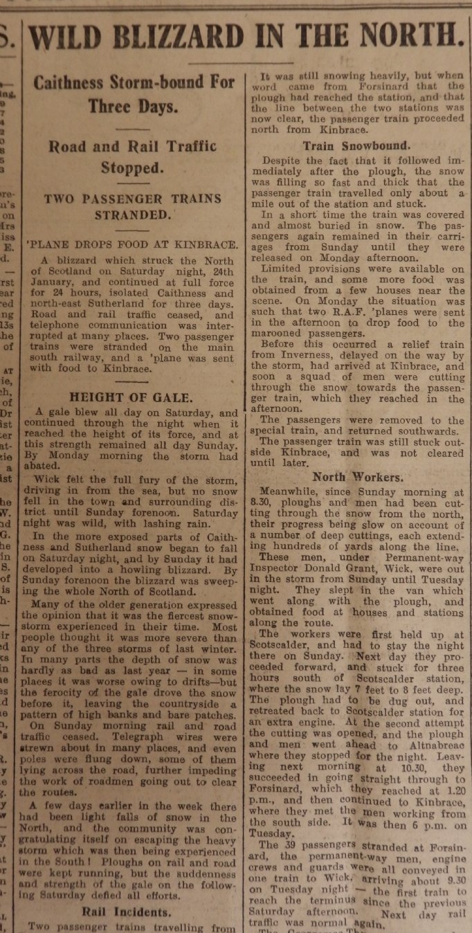Back in Caithness, the snowstorms that had afflicted the county over the previous few weeks showed no signs of stopping. The worst weather had come the previous week, and the John O’Groat Journal now reported the “Wild Blizzard in the North” of 24 January that “continued at full force for 24 hours, isolated Caithness and north-east Sutherland for three days. Road and rail traffic ceased, and telephone communication was interrupted at many places. Two passenger trains were stranded on the main south railway, and a plane was sent with food to Kinbrace,” near Helmsdale.Once again, schools across the county were affected. Bower School wrote plaintively in its Log Book on 4 February: “Heavy snowstorm, all roads snowbound. Two teachers present but no pupils.”And on Feb 6 Stanstill School Log Book records simply, “The pupils were sent home on Tuesday owing to [snow] drift.”