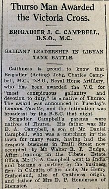 The problem, as he explained in a letter to the Scottish Education Department, was that many children were not being taught in regular schools because of the war, but in church halls and other venues. Mr Georgeson, solicitor and clerk to the School management Committee, had ruled that as a result it wasn’t possible to prosecute the parents of children who failed to attend: “The result is that the parents of the more unsatisfactory type are inclined to take advantage of this”. As the Director said: “I cannot see how there should be any difficulty in obtaining a conviction whether the pupils are in attendance at a school or at a building authorised as a school.” Finally this week, the John O’Groat Journal reported the award of the Victoria Cross to Brigadier John Charles “Jock” Campbell of Thurso for “most conspicuous gallantry and devotion to duty” in the Western Desert campaign the previous year. Brigadier Campbell led a small force defending the aerodrome of Sidi Rezegh near Tobruk on 21 and 22 November from attacks by two armoured divisions of the Afrika Korps. Directing the battle from the back of a tank, Campbell on several occasions manned a gun to replace casualties, and refused to leave the field when he was wounded. As one writer said, Campbell won the VC many times that day.