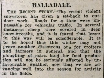 Farmers in rural districts were also badly hit. The John O’Groat Journal reported poetically that in Halladale, “The recent violent snowstorm has given a set-back to outdoor work. Roads for a time were impassable for vehicular traffic. In several instances sheep were covered in deep snow-wreaths, and it is feared that losses in this way will be considerable.”Meanwhile the Director of Education was having difficulties quite apart from the weather.