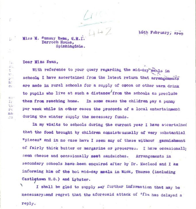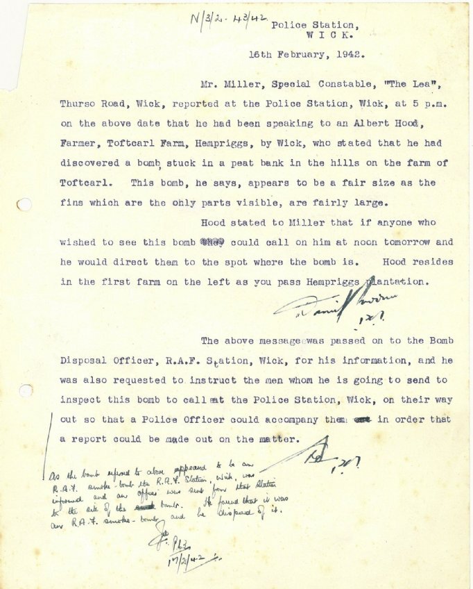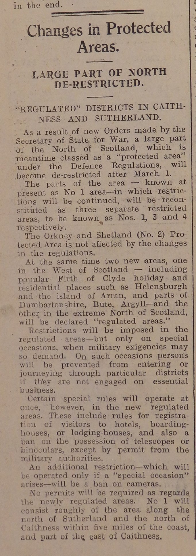 property. On 16 February Albert Hood, a farmer at Toftcarl Farm, Hemriggs by Wick, told the police that “he had discovered a bomb stuck in a peat bank in the hills on the farm of Toftcarl.” The police passed the information to R.A.F. Wick, and the bomb disposal officer went to investigate. A note in the margin states: “He found it was an R.A.F. smoke-bomb and he disposed of it.” With Germany fully committed to fighting in Russia the authorities were able to relax some of the restrictions on travel to the North Highlands. The John O’Groat Journal reported that from the first of March, “a large part of the North of Scotland, which is meantime classed as a “protected area” … will become de-restricted”. Only the north of Sutherland and Caithness within five miles of the coast, and part of the east coast, would remain restricted; the rest of the county would be “de-restricted” unless in case of an emergency.Finally this week the Director of Education provides an insight into mid-day meals in rural schools across the
