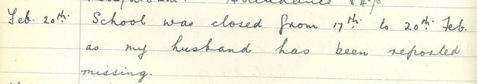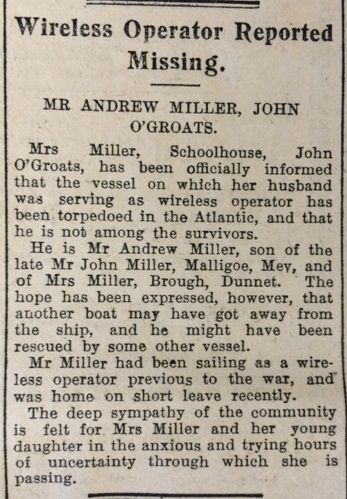 Mrs Miller, the teacher at John O’Groats School, made a brief, tragic entry in the log book on 20 February: “School was closed from 17th to 20th Feb. as my husband has been reported missing.”A report in the John O’Groat Journal the following week told the sad story: “Mrs Miller, Schoolhouse, John O’Groats, has been officially informed that the vessel on which her husband was serving as wireless operator has been torpedoed in the Atlantic, and that he is not among the survivors.” The paper added, “The hope has been expressed, however, that another boat may have got away from the ship, and he might have been rescued by some other vessel.”
