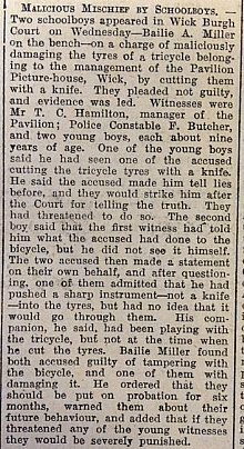 unconvincing defence, one of the accused “admitted that he had pushed a sharp instrument – not a knife – into the tyres, but he had no idea that it would go through them.” The boys were found guilty and put on probation – and warned “if they threatened of the young witnesses they would be severely punished.”