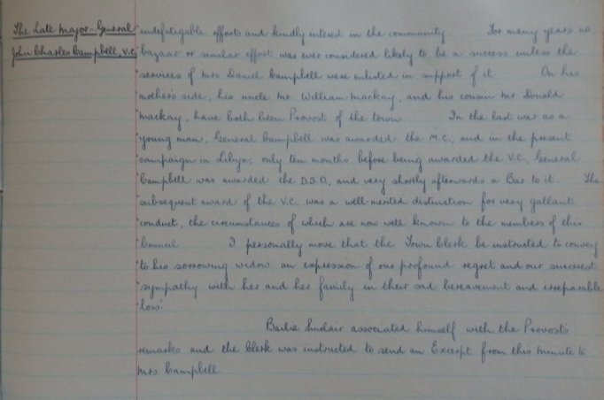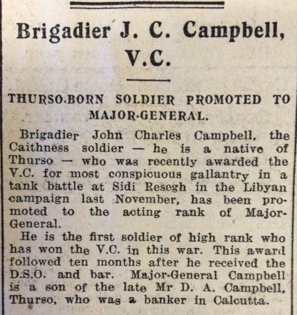 The John O’Groat Journal reported this week that a native son of Thurso, Brigadier John Charles “Jock” Campbell, who had recently been awarded the Victoria Cross “for most conspicuous gallantry in a tank battle at Sidi Resegh in the Libyan campaign last November, has been promoted to the acting rank of Major-General.”