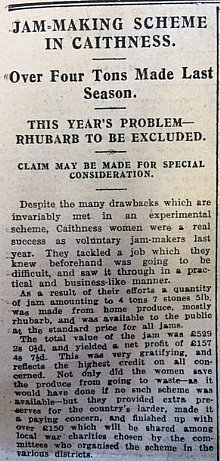 Macgregor, Clyth Mains, that there are two mines floating off-shore about half mile south of Clythness Lighthouse”. There was mixed news regarding the county’s jam scheme this week. During the previous year voluntary jam-makers in Caithness had made over four tons of jam from home produce. As the John O’Groat Journal noted, “Not only did the women save the produce from going to waste … but they provided extra preserves for the country’s larder, made it a paying concern and finished up with over £150 which will be shared among local war charities.” But most of the jam had been made from rhubarb, and next year rhubarb was to be excluded from the scheme; as Caithness was not a fruit-producing county, officials were considering an appeal.Finally this week, the John O’Groat Journal reported that the Spitfire “Caithness”, which had