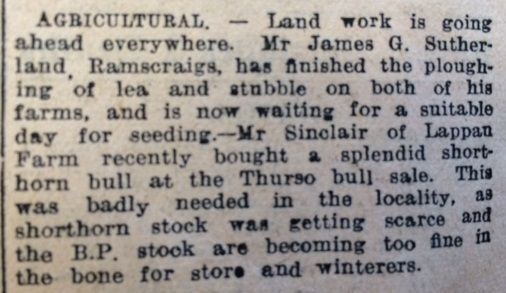 In Caithness, farmers were getting ready for the new season. As the John O’Groat Journal reported in Dunbeath, “Land work is going ahead everywhere. Mr James G. Sutherland, Ramscraigs, has finished the ploughing of lea and stubble on both of his farms, and is now waiting for a suitable day for seeding.”