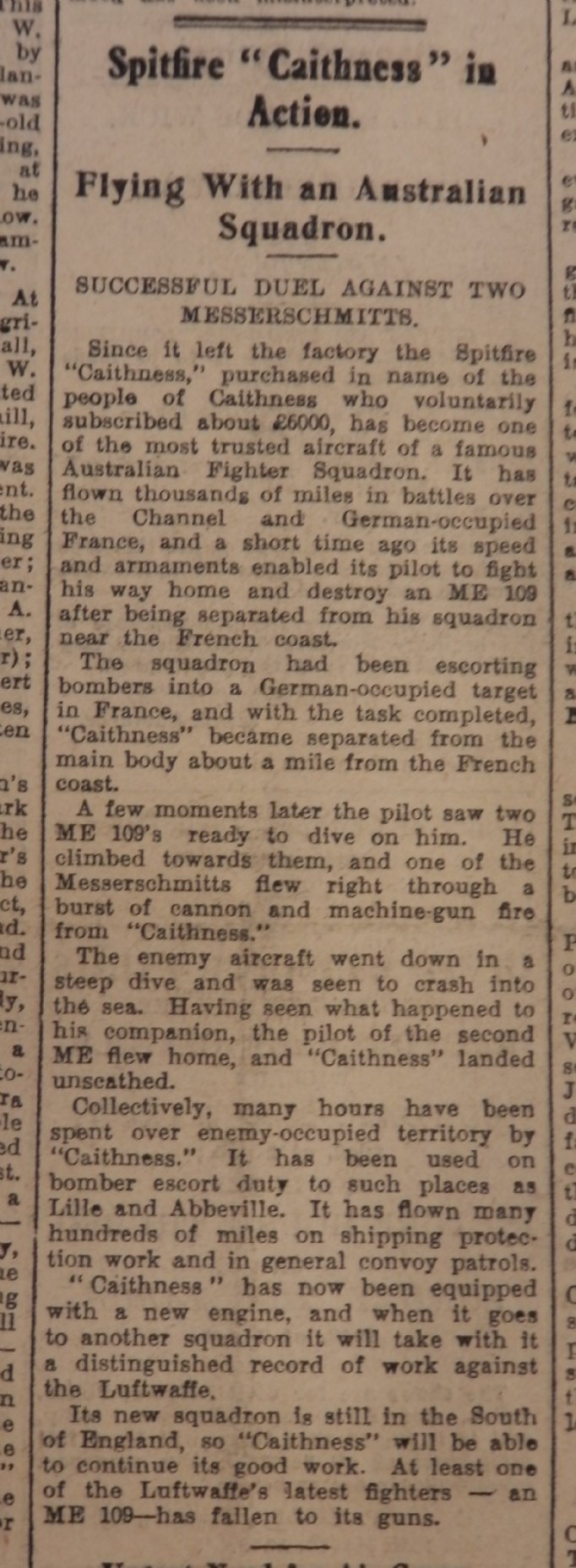 been paid for by funds raised in the county, had been in action recently over the Channel. The plane had become separated from its squadron: “A few moments later the pilot saw two ME109’s ready to dive on him. He climbed towards them, and one of the Messerschmitts flew right through a burst of cannon and machine-gun fire from “Caithness”. The enemy aircraft went down in a steep dive and was seen to crash into the sea. Having seen what happened to his companion, the pilot of the second ME flew home and “Caithness” landed unscathed.”