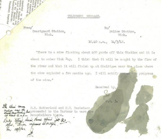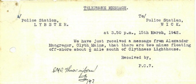 Mines were still a constant threat to the county’s coasts. On 14 March Wick Coastguard reported, “There is a mine floating about 400 yards off this Station and it is about to enter Wick Bay. I think that it will be caught by the flow of the river and that it will finish up at Shaltigoe near the place where the mine exploded a few months ago.” The police warned the householders near the harbour. A note in the margin reads: “The mine came ashore near the North Head Bathing Pool at 12.10pm.”Next day the Lybster police reported: “We have just received a message from Alexander