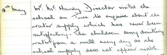 Meanwhile Bilbster School near Wick was having trouble of a different kind. On 11 May the log book records: “Mr McHardy, Director [of Education], visited the school on Tuesday to enquire about the water supply which has never been satisfactory. The children carry drinking water from a well every day as the school supply does not appear usable.”
