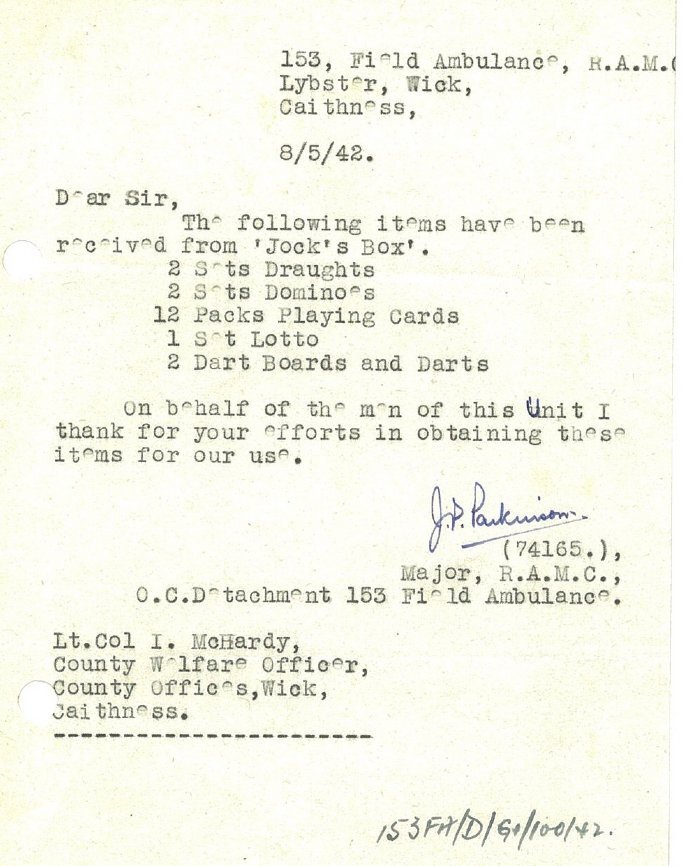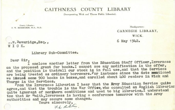 Dr Robertson, the Wick Librarian, was becoming exercised over the question of books for soldiers. The War Office wanted additional books to be provided for service personnel, whereas in the smaller libraries of Caithness “all our stock is in full use, and … the Services are being treated as ordinary borrowers”. As Dr Robertson pointed out, “the trouble is the War Office, who consulted an English librarian quite ignorant of our northern conditions and used to big libraries.”