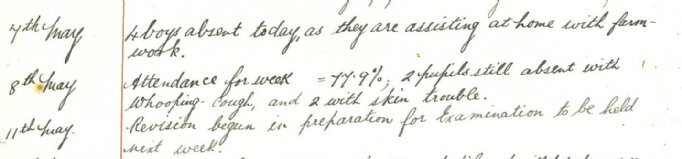 This of course had a knock-on effect on rural school attendances. The Head Teacher of Stemster School in Bower recorded in the log book for 7 May: “4 boys absent today as they are assisting at home with farm-work.” Helping on the farm wasn’t the only reason for absence, though: next day’s entry reads, “2 pupils still absent with whooping cough, and 2 with skin trouble.”
