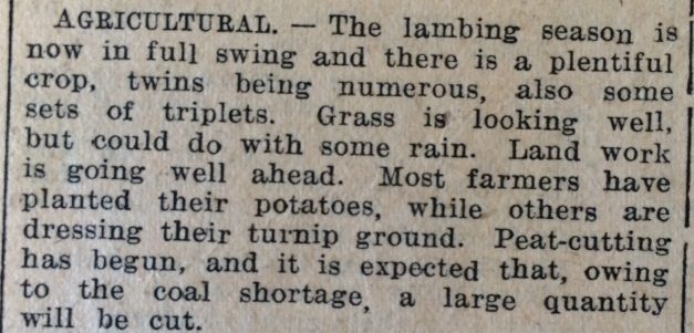 In Caithness, the spring planting and lambing season was well underway. The John O’Groat Journal reported for Dunbeath that “Grass is looking well, but could do with some rain. Land work is going well ahead. Most farmers have planted their potatoes, while others are dressing their turnip ground. Peat cutting has begun.”