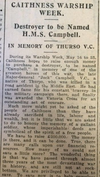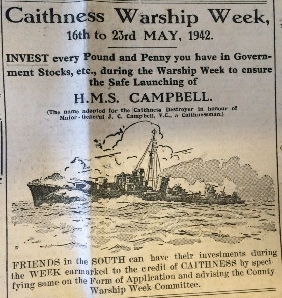The Armed Services collected games and leisure equipment so their members could entertain themselves, known as “Jock’s Box”. An idea of what they contained is shown in a letter from the Royal Army Medical Corps stationed at Lybster, acknowledging receipt of 2 sets draughts; 2 sets dominoes; 12 packs playing cards; 1 set Lotto; 2 dart boards and darts.Finally this week, after it success in raising funds for a “Caithness” Spitfire, the county was gearing up for Warship Week later in the month. The target was to raise £200,000 “to purchase a destroyer, to be named ‘Campbell’ in memory of one of the greatest heroes of this war, the late Major-General “Jock” Campbell, VC who was killed in a road accident in the Middle East.” As the advertisement said, “Invest every Pound and Penny you have in Government Stocks, etc., during the Warship Week to ensure the safe launching of H.M.S. Campbell.”
