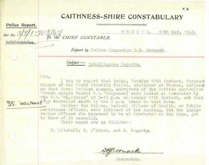 Children across the county faced a more immediate threat than enemy gas attacks, however. The log book entry for Bower School on 13 May ominously reads: “Time-table considerably upset. School Dentist here from 11:45 a.m. to 3.10 p.m.Merchant shipping was still suffering at the hands of U-boats and the Luftwaffe, and survivors were still being landed in Caithness. On 12 May Inspector Cormack of Thurso wrote, “I beg to report that today, Tuesday 12th instant, Sergeant Shiach of the Field Security Police, stationed at Thurso, informed me that three British seamen, survivors of the British controlled French cargo vessel S.S. “Melpomne”, were landed at Scrabster by the S.S. “St. Ninian” at 5-15 p.m..on Monday 11th instant.”