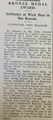 Finally this week, The John O’Groat Journal reported that Coastguard John Malcolm from Wick had been awarded the Bronze medal for gallantry during a rescue by the Johnshaven Life-Saving Crew last November. A ship which had been bombed by a German raider had drifted ashore at Kinnaber in a storm. A rocket line had been fired to the ship but had become fouled. “Between the beach and the obstruction was a 150-yard stretch of water churned into thunderous surf by the gale. While his comrades ashore kept the line taut, Coastguard Malcolm hauled himself out hand over hand to the obstruction. Time and again the seas swept over him. Clearing the line at the third attempt, he was flung high in the air, but held on grimly and was hauled ashore.” As a result of his courageous action, 41 lives were saved.
