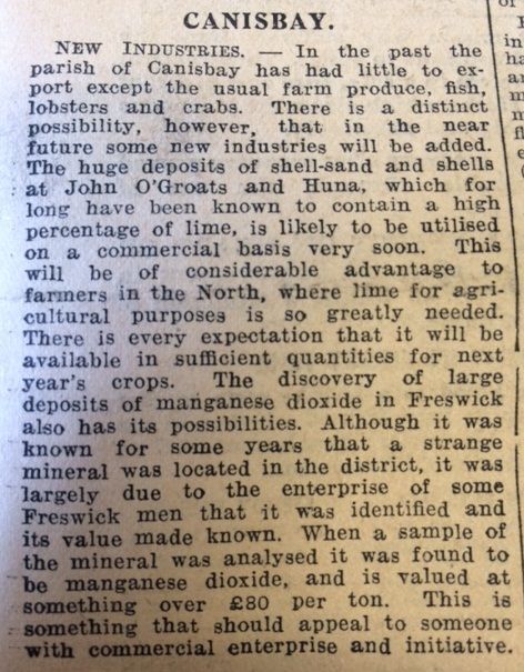 An entry from Brabster School in Canisbay Log Book shows how affairs at home could impact on a child’s education: “Irene Sinclair has been absent since Monday to nurse her Grandmother.”New industries were being proposed for Canisbay, according to the John O’Groat Journal. “In the past the parish of Canisbay has had little to export except the usual farm produce, fish, lobsters and crabs. There is a distinct possibility, however, that in the near future some new industries will be added. The huge deposits of shell-sand and shells at John O’Groats and Huna, which for long have been known to contain a high percentage of lime is likely to be utilised on a commercial basis very soon.”