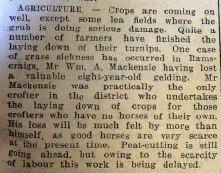 The John O’Groat Journal reported that crops in Dunbeath were coming on well, but peat-cutting was hampered by the scarcity of labour. It mentions the death of a horse owned by Mr William Mackenzie of Ramscraigs, and this highlights the scale of many small crofts across the county: “Mr Mackenzie was practically the only crofter in the district who undertakes the laying down of crops for those crofters who have no horses of their own. His loss will be felt by more than himself, as good horses are very scarce at the present time.”