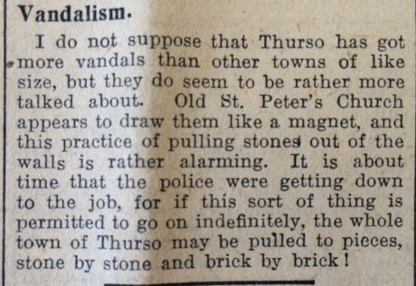 Finally this week, ‘Norseman’ in the John O’Groat Journal commented on the vandalism of St Peter’s Church mentioned last week: “I so not suppose that Thurso has got more vandals than other towns of like size, but they do seem to be rather more talked about. Old St peter’s Church appears to draw them like a magnet, and this practice of pulling stones out of the walls is rather alarming… if this sort of thing is permitted to go on indefinitely, the whole town of Thurso may be pulled to pieces, stone by stone and brick by brick!”