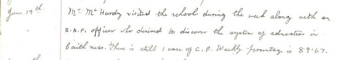 Killimster School near Wick had a distinguished visitor on 19 June: “Mr McHardy visited the school along with an R.A.F. officer who desired to discover the system of education in Caithness. There is still one case of C.P. [Chicken Pox]”