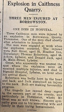 July, and was going to hold a “service for Wick day schools (close of term)” at Bridge Street Church on 3 July. Ian McHardy, Director of Education, wrote on 27 June to the head teachers of the schools concerned to make sure their pupils turned up: “I am aware that many pupils are accustomed to absent themselves on the last day of the session but in view of the importance of the occasion I think a special request might be made for as full an attendance as possible.”The John O’Groat Journal reported a tragic accident this week: “Three Caithness men were injured by an explosion in Borrowston Quarry, Thrumster. One of the men died shortly after admission to hospital. The men were engaged at work when the explosion occurred. The injured were Neil Groat, aged 55, Heather Inn, Thrumster; Thomas Robertson, aged 66, Achow, Lybster and Donald Jack, aged 36, Main Street, Lybster.” The men were taken to Bignold Hospital, which had been relocated to Lybster during the war, where Neil Groat died an hour later. It was believed that an old unexploded charge had been set off while the men were working.
