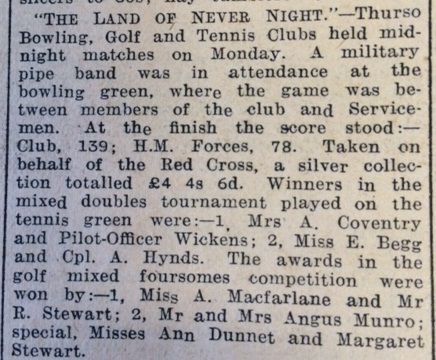 “It appeared that there could be no herring cured without Government Licence, and Mr Donaldson explained that the present controlled price for cured herring was economically impossible without a Government subsidy. The Government were encouraging kippering at the expense of curing. It had been noted that the Government had made special provision for curing herring and cured herring in for Ross-shire, and strong exception was taken to this privilege when the need was equally great in Caithness and Sutherland.” Finally this week, Thurso had celebrated the longest day on 21 June in traditional fashion, as the John O’Groat Journal reported, when the bowling, golf and tennis clubs “held midnight matches on Monday. A military pipe band was in attendance at the bowling green, where the game was between members of the club and servicemen. At the finish the score stood:- Club, 139; H.M. Forces, 78.” At this time of year the sun rises in Caithness at about 4.04 am, and sets around 22.27 pm.