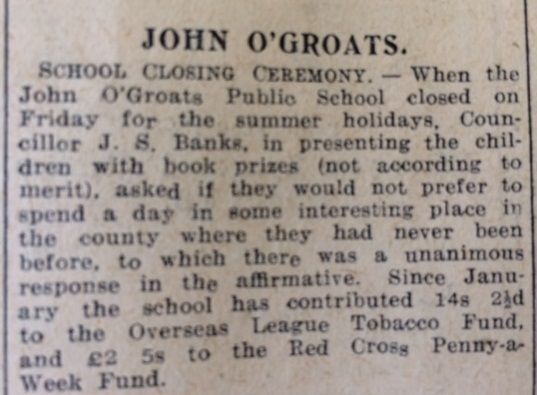 It was the start of the school holidays in Caithness, and the annual prizes were being handed out. In John O’Groats School, as the John O’Groat Journal reported, “Councillor J.S. Banks, in presenting the children with book prizes (not according to merit), asked if they would not prefer to spend a day in some interesting place in the county where they had never been before.” Unsurprisingly “there was a unanimous response in the affirmative”!