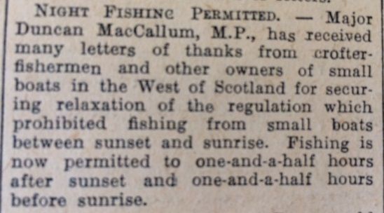 The paper also reported that another wartime restriction had been lifted, affecting crofter-fishermen and other owners of small boats in the West of Scotland: the “regulation which prohibited the fishing from small boats between sunset and sunrise. Fishing is now permitted to one-and-a-half hours after sunset and one-and-a-half hours before sunrise.”