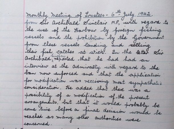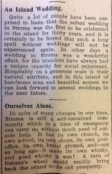 Indeed, it was clear that many people now had the sense that the tide of the war was on the turn at last. Wick Harbour Trust this week debated the ban on foreign fishing vessels being allowed to land their catches and sell them in Wick, which was having a detrimental effect on harbour revenues. They’d approached Sir Archibald Sinclair M.P. for help, and he now wrote to say that “he had had an interview at the Admiralty with regard to the ban now enforced and that the application for modification was receiving most sympathetic consideration.” Finally this week, “Norseman” in the John O’Groat Journal reported that a recent wedding on the island of Stroma “was the first to be celebrated in the island for thirty years”. After expressing the hope that this would be the first of many, the writer reflected poignantly that Stroma was still a self-sufficient community: “It has its own church, its own school, its own shops, its own post-office, its own burial ground, and – not so long ago – it made its own whisky, and good whisky it was! A turn of fortune’s wheel would readily bring back the island to its old prosperity.”