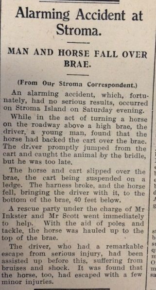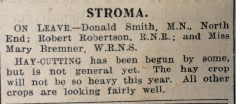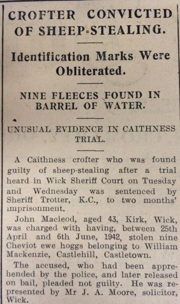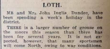In Caithness summer was well advanced and some farmers had begun hay-cutting, but this was not yet widespread. In Loth, the John O’Groat Journal reported that “there is a larger number of grouse on the moors this season than there has been for several years. It is not expected, however, that many sportsmen will come North, owing to war conditions.” The main news in the John O’Groat Journal this week was that John Macleod, a crofter near Wick, had been convicted of sheep-stealing after nine fleeces were discovered in a water-barrel on his croft. Earlier in the summer 68 Cheviot ewe hoggs had been stolen from William Mackenzie of Castlehill, although 51 were later recovered. Acting on information received, police searched Macleod’s croft and found nine of the missing sheep, which had been shorn, and the fleeces soaking in water (allegedly to remove the owner’s markings). The decisive testimony came from Mackenzie’s shepherd, John Morrison, who said, “Before they came within 50 or 60 yards of me I knew they were our sheep. Their faces were more familiar to me than many of those I am seeing in the Court here today (laughter).” Speaking of one sheep, “he easily knew it because it had a short tail and was kiltie (bare) on the back and hind quarters.” The Government had written to Wick Burgh’s Electricity Department, “pressing for the release of Mr Manson so that he, being a marine engineer, can be employed in shipbuilding as a work of urgent national importance.” The Manager of the Electricity Department was clearly unimpressed by the urgency, and the Council noted with approval that “steps [were being] taken to retain Mr Manson’s services.”The John O’Groat Journal reported an “alarming accident” on Stroma Island. A young
