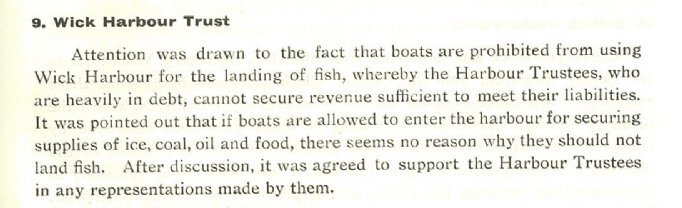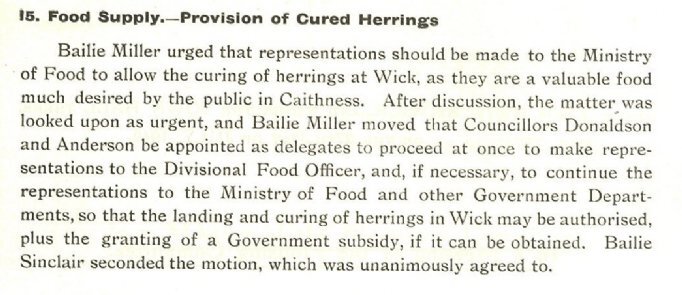 Harbour Trustees in their bid to let foreign vessels land fish at the harbour: “Attention was drawn to the fact that boats are prohibited from using Wick Harbour for the landing of fish, whereby the Harbour Trustees, who are heavily in debt, cannot secure revenue sufficient to meet their liabilities. It was pointed out that if boats are allowed to enter the harbour for securing supplies of ice, coal, oil and food, there seems no reason why they should not land fish.”The Council also resolved that “representations should be made to the Ministry of Food to allow the curing of herrings at Wick, as they are a valuable food much desired by the public in Caithness.” Delegates were appointed to take the matter up with Government Departments, “so that the landing and curing of herrings in Wick may be authorised, plus the granting of a Government subsidy, if it can be obtained.”