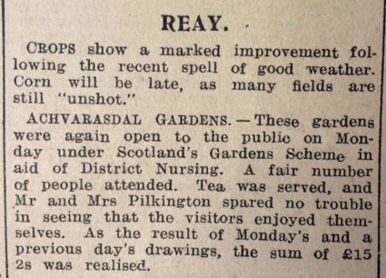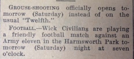 The John O’Groat Journal reported this week that grouse shooting would begin on Saturday 1 August and not on the more usual “Glorious Twelfth”. In the fields of Caithness haymaking was underway; the Reay District News said that, “Crops show a marked improvement following the recent spell of good weather. Corn will be late, as many fields are still ‘unshot’”.Wick Burgh Council agreed on 27 July to support the