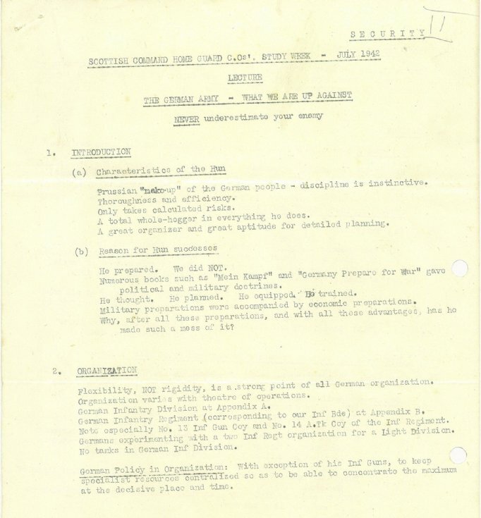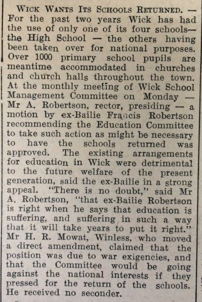 The John O’Groat Journal this week reported that the Wick School Management Committee wanted its schools returned. As the paper observed, “For the past two years Wick has had the use of only one of its four schools – the High School – the others having been taken over for national purposes. Over 1,000 primary school pupils are meantime accommodated in churches and church halls throughout the town.” The rector, presiding, was in full agreement: “’There is no doubt,’ said Mr A. Robertson, ‘… that education is suffering, and suffering in such a way that it will take years to put it right.’” Only one member, Mr H.R. Mowat of Winless, disagreed, stating that “the position was due to war exigencies, and that the Committee would be going against the national interests if they pressed for a return of the schools.” However, as the report pointedly concluded: “He received no seconder.”Finally this week, the Home Guard received a lecture on “The German Army – What We Are Up Against”, including “Characteristics of the Hun.” These national characteristics are surprisingly complimentary: “Discipline is instinctive … Only takes calculated risks … A great organiser and great aptitude for detailed planning.” Asking the “reason for Hun successes”, the lecture notes observe: “He prepared. We did NOT”, before posing the highly pertinent question: “Why, after all these preparations, and with all these advantages, has he made a mess of it?”