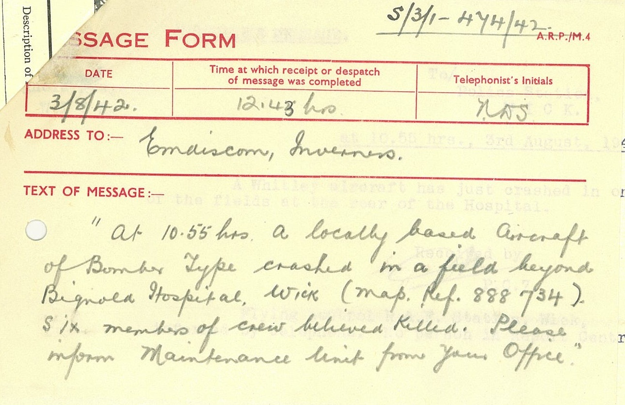 The Caithness Police files contain the following tragic incident report dated 3 August: “At 10.55 hrs a locally based aircraft of Bomber Type crashed in a field beyond Bignold Hospital, Wick… Six members of crew believed killed. Please inform Maintenance Unit from your office.”