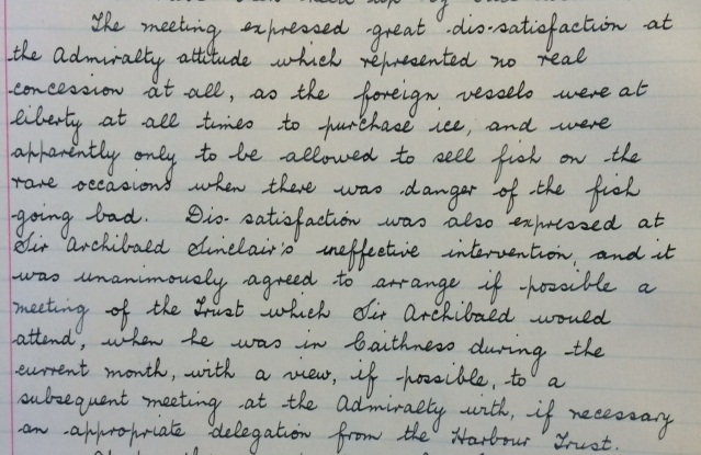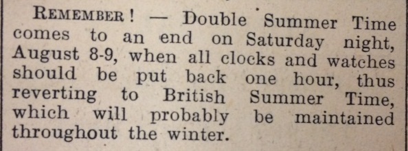 The rather confusing timekeeping of the war continued this week as the John O’Groat Journal reported that Double Summer Time was coming to an end on Saturday night, “when all clocks and watches should be put back one hour, thus reverting to British Summer Time, which probably be maintained throughout the winter.”To the disgust of Wick Harbour Trust the issue of foreign vessels being allowed to land fish at Wick was still no nearer being resolved. On 3 August, “The meeting expressed great dis-satisfaction at the Admiralty attitude which represented no real concession at all, as the foreign vessels were at liberty at all times to purchase ice, and were apparently only to be allowed to sell fish on the rare occasion when there was danger of the fish going bad.” As for the role played by the sitting MP in the discussions, “Dis-satisfaction was also expressed at Sir archibald Sinclair’s ineffective intervention.”