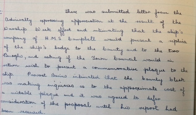 The county had recently held a fundraising campaign to adopt a warship, to be named after Major Jock Campbell of Thurso. The Burgh of Thurso recorded in the minutes that a letter had been received from the Admiralty, “expressing appreciation at the result of the Warship Week effort and intimating that the ship’s company of H.M.S. Campbell would present a replica of the ship’s badge to the County and to the two Burghs, and asking if the Town Council would in return wish to present a commemorative plaque to the ship.” The plaque now sits in Wick Town Hall. [See http://www.ambaile.org.uk/en/item/item_writtenword.jsp?item_id=85156 for image of the plaque]