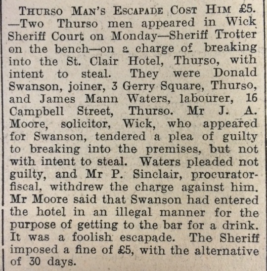 Finally this week the John O’Groat Journal reported that two Thurso men had appeared in Wick Sheriff Court “on a charge of braking into the St Clair Hotel, Thurso, with intent to steal.” The charge against one of the men was dropped, while the other, Donald Swanson, came up with a novel defence: “Mr Moore [his solicitor] said that Swanson had entered the hotel in an illegal manner for the purpose of getting to the bar for a drink. It was a foolish escapade.” The Sheriff accepted the man’s story, but still fined him £5.