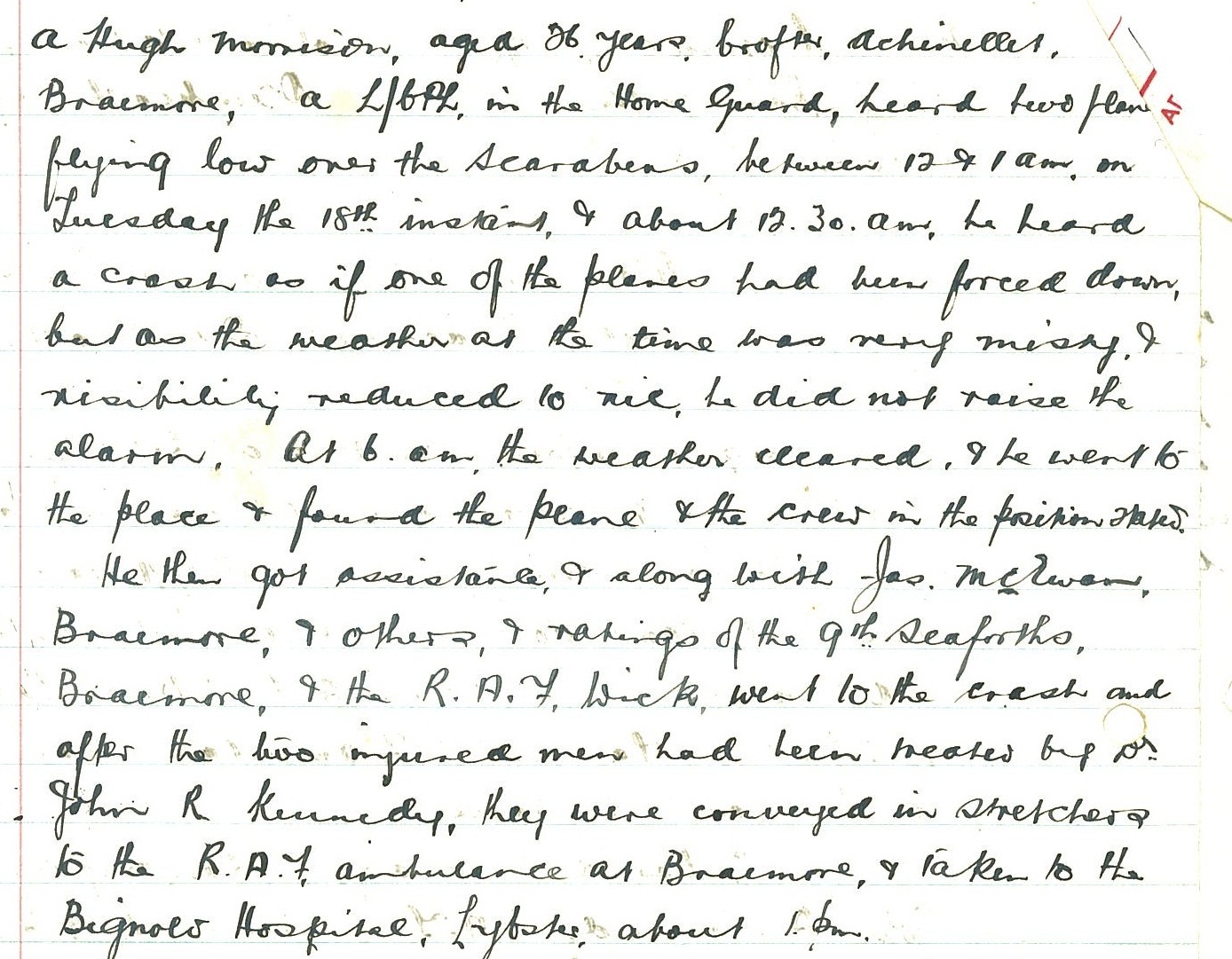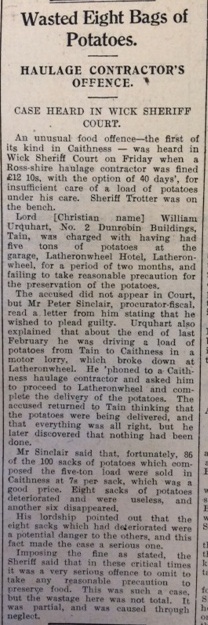 Lord William Urquhart [Lord was his Christian name], a haulage contractor from Tain, pleaded guilty to an unusual charge this week, reported in the John O’Groat Journal, which shows the seriousness of the wartime food restrictions. He’d been driving 100 sacks of potatoes to Caithness from Tain, and had got as far as Latheronwheel when his lorry broke down. He left the load at the Latheronwheel Hotel, thinking that the rest would be delivered by another contractor. In the end, all but eight bags were disposed of, but the rest were left to rot: and so, for allowing the waste of eight bags of potatoes, Urquhart was fined £12 10sOn 18 August the Caithness Police received the tragic news that a plane from Lossiemouth had crashed on East Scaraben Hill at Braemore, near Dunbeath. Three of the crew were killed, while two were injured and had to be taken to Braemore by stretcher, and then on to Bignold Hospital at Lybster. “Hugh Morrison, aged 86 years, crofter, Achinellet, Braemore, a [Lance Corporal] in the Home Guard, heard two planes flying low over the Scarabens between 12 & 1 am on Tuesday the 18th instant, & about 12.30 am he heard a crash as if one of the planes had been forced down; but as the weather at the time was very misty, & visibility reduced to nil, he did not raise the alarm. At 6am the weather cleared & he went to the place and found the plane & the crew in the position stated.”