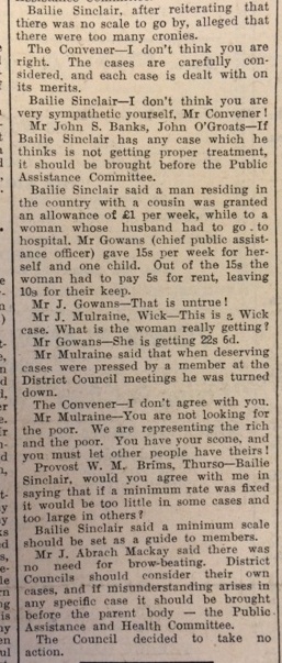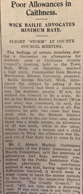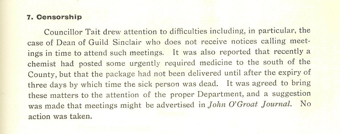 The John O’Groat Journal reported that a debate in Caithness County Council over the allowances given to the “destitute poor” in the county and whether there should be a minimum rate. In a heated discussion it was alleged that one man was receiving £1 a week, whereas a woman with a child in Wick was only receiving 15 shillings, which the chief public assistance officer denied (“That is untrue!”). Mr Mulraine then declared, “You are not looking for the poor. We are representing the rich and the poor. You have your scone, and you must let other people have theirs!” The Council decided to take no action. Finally this week, the delays arising from having Caithness letters and parcels censored in Inverness were having serious consequences, as raised at a meeting of Wick Burgh Council: “It was also reported that recently a chemist had posted some urgently required medicine to the south of the County, but that the package had not been delivered until after the expiry of three days, by which time the sick person was dead.”