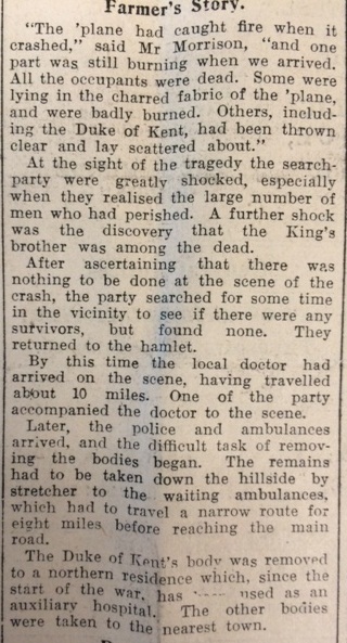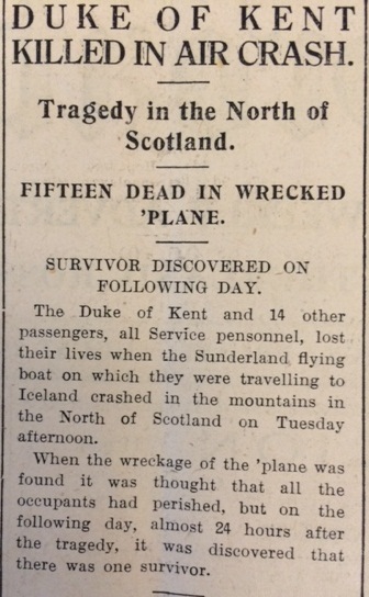 The death of the Duke of Kent in the plane crash was of course headline news, and the John O’Groat Journal reported it fully. The story was all the more dramatic because the only survivor, Flight Sergeant Jack, had left the scene by the time the search party arrived.